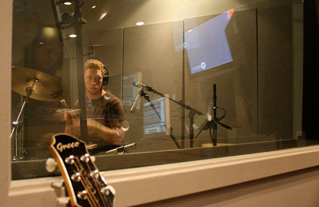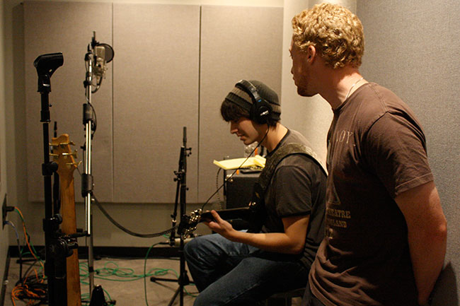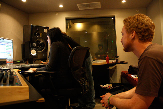 San Francisco Bay Area local band Sol Viridian has gone on hiatus, but not before completing recording their single "Venus at the Mirror" which was produced by Misfit Moon Productions. Pictured here are the dynamic duo: Brian Robertson and Dan Escobedo in studio.